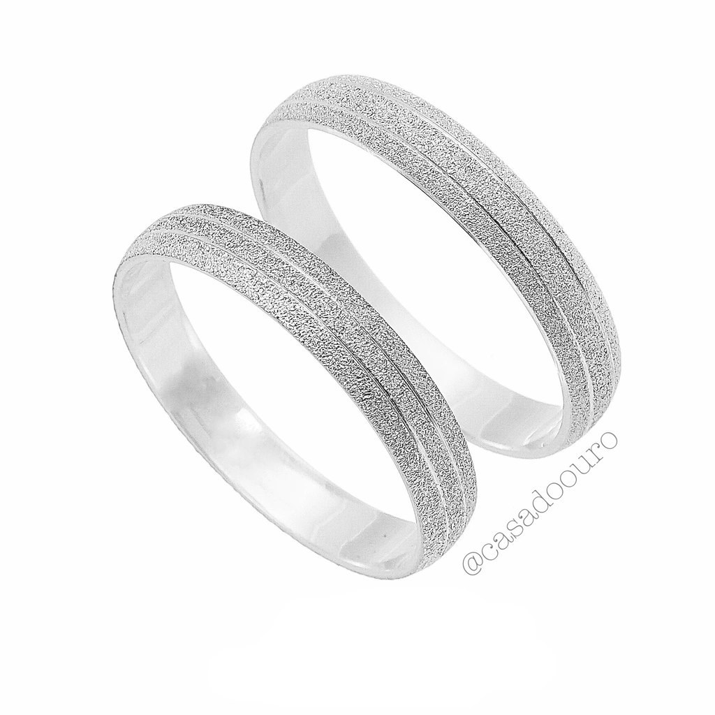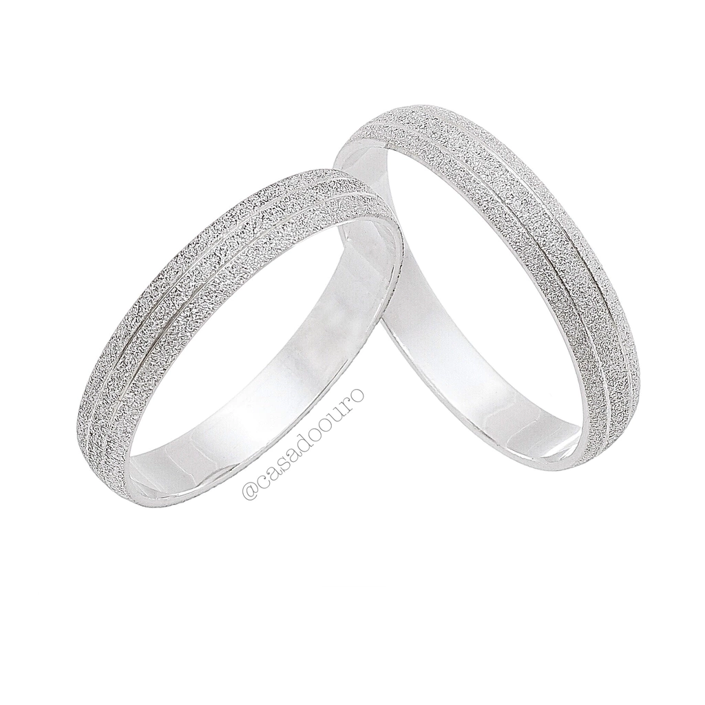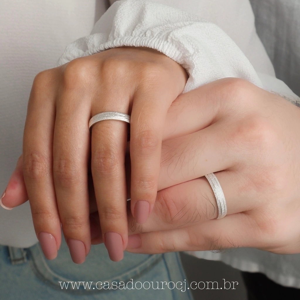 Par de alianças estreitas, fosca com dois frisos finos, em prata 950. Medidas aproximadas: Largura: 4mm. | Espessura: 1,3mm. | Peso médio do par: 5g. (o peso pode variar de acordo com os aros/tamanho dos dedos selecionados). | O par de alianças será confeccionado especialmente para o casal. | Personalize incluindo pedras na feminina (consulte diferença de valor). | Prazo de entrega 15 a 20 dias úteis. | COD: SA01.