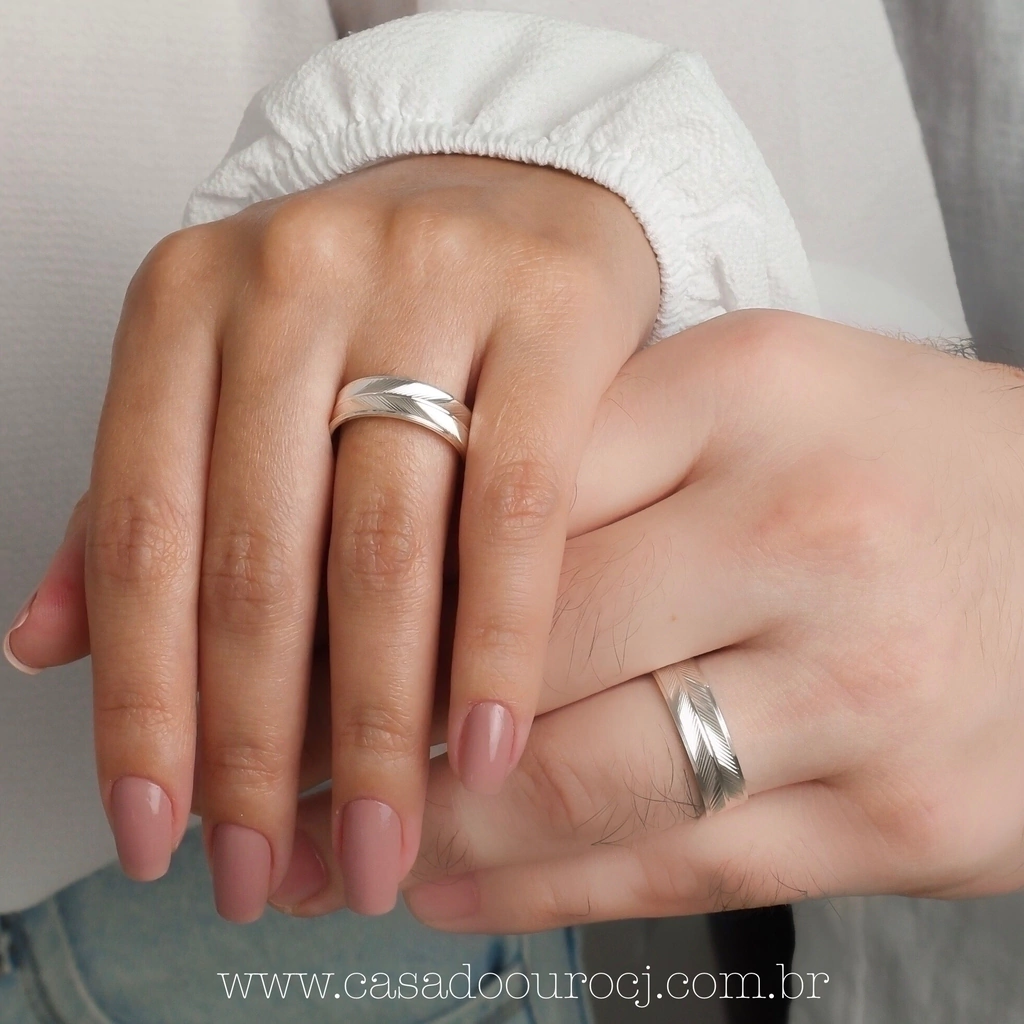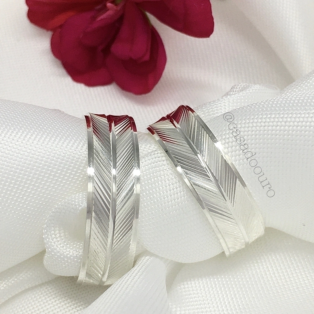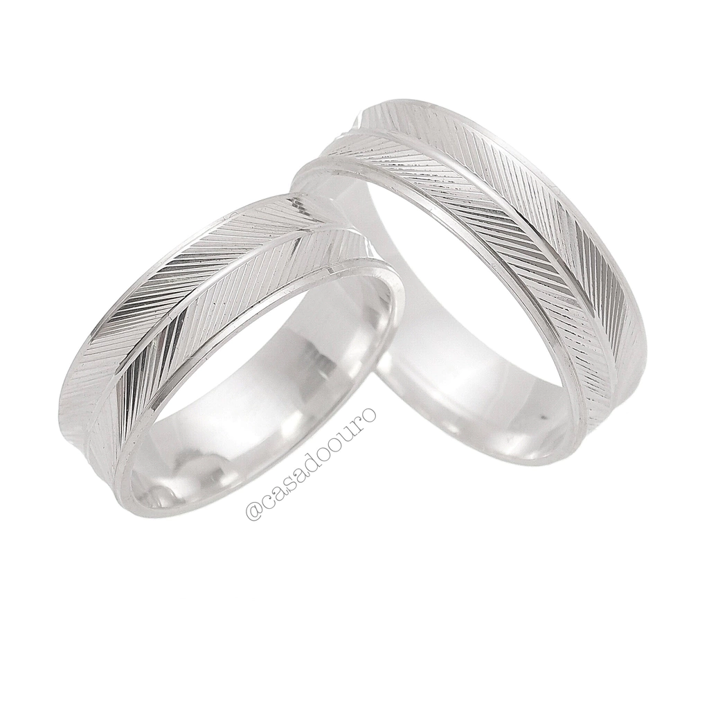 Par de alianças trabalhada, tipo pena, em prata 950. Medidas aproximadas: Largura: 6mm. | Espessura: 1,1mm. | Peso médio do par: 7g. (o peso pode variar de acordo com os aros/tamanho dos dedos selecionados). | O par de alianças será confeccionado especialmente para o casal. | Personalize incluindo pedras na feminina (consulte diferença de valor). | Prazo de entrega 15 a 20 dias úteis. | COD: SA18.