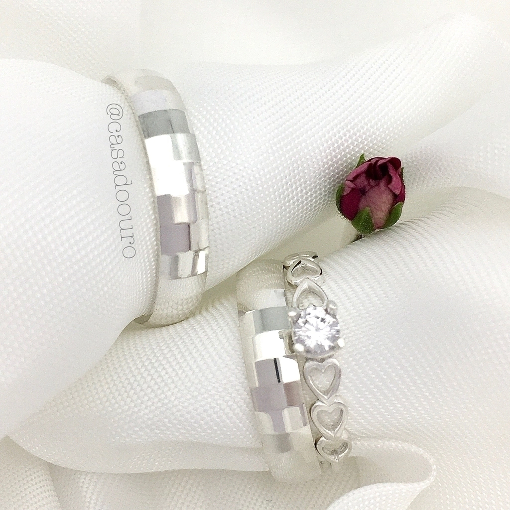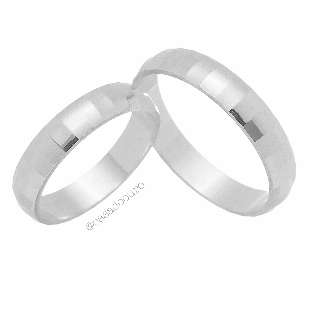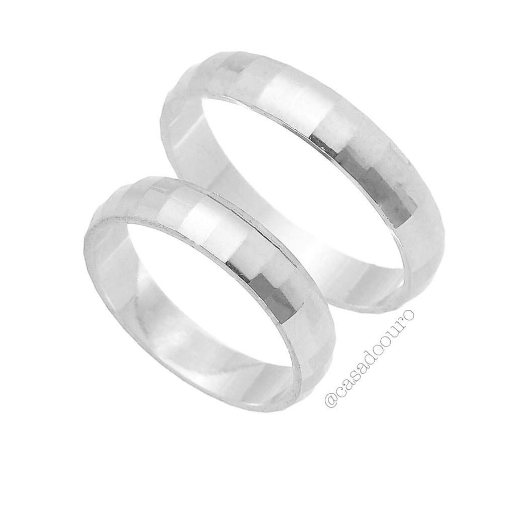 Par de alianças sextavada, em prata 950. Medidas aproximadas: Largura: 4mm. | Espessura: 1,2mm. | Peso médio do par: 5,4g. (o peso pode variar de acordo com os aros/tamanho dos dedos selecionados). | O par de alianças será confeccionado especialmente para o casal. | Personalize incluindo pedras na feminina (consulte diferença de valor). | Prazo de entrega 15 a 20 dias úteis. | COD: SA30.