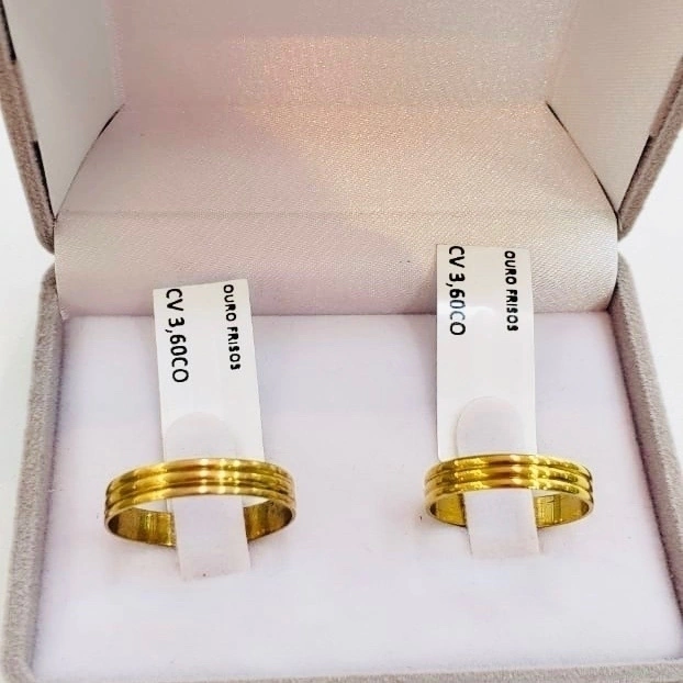 Par de alianças polidas com dois frisos centrais em baixo relevo, em ouro 18k (750). Peso médio do par: 3,6g (o peso pode variar de acordo com os aros/tamanho dos dedos selecionados). | O par de alianças será confeccionado especialmente para o casal. | Personalize incluindo pedras na feminina e/ou detalhe fosqueado (consulte diferença de valor). | Prazo de entrega 03 a 20 dias (consulte-nos) | CV 3.60. Cod 9598